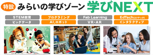 ICT機器、デジタル教材、Eラーニングなどの教育分野に関する日本最大の展示会です。とくに今年は、「みらい学びゾーン」といって、新しい「学び」についての展示が大きくなっていました。