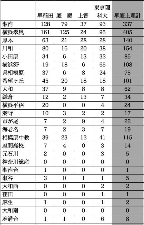 地域のトップ校である、川和、小田原、希望ヶ丘、県相模原などは80名〜100名。もちろん、現役、浪人もふくめて、複数合格もカウントしている数ですから、これを3で割ったあたりが、現役で合格している実数だと考えるとよいはずです。ということは、このレベルの高校から早慶上理の大学に現役で合格する数は30名ほどということになります。全校生徒の1割強といったところでしょうか。秦野、市が尾、座間のラインになると20名前後、そこから下の高校からはほぼ合格者はいない、というのが現実です。