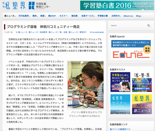 3月12日に「ユニコムプラザさがみはら」で実施した「ロボットプログラミング」のワークショップのことを「月刊 私塾界」さんに紹介いただきました。
