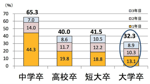 変化の激しい時代です。3年離職率が高いことを批判的にみるのではなく、そうした時代なんだと受け入れる姿勢も大切なのではと思います。と同時に、そうした時に自分を高く売れる「武器」を持つことこそ最も重要なのではないでしょうか。そり「武器」は、中学、高校、大学でも身につけられます。そんな観点から「勉強」というものをとらえてみてはどうでしょう。