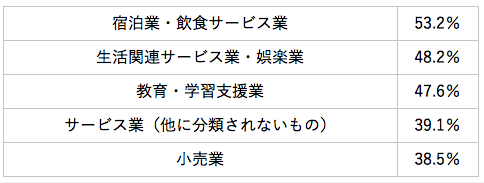 そうなんです、3年以内の離職率は3割を越えているんですね。5割をこえる業種もあります。どんな業種が離職率が高いかというと、下の表のような様子です。教育・学習支援などは2人に1人が3年以内にやめていきます。確かにこの業界はブラックばかりですからね(^^;)