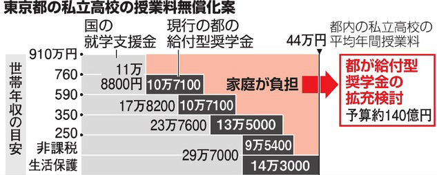 現在、公立高校に通っている生徒に対しては、世帯収入が910万円未満を対象に授業料は無償化されています。市立高校に通う生徒にも、ほぼ同額の就学支援金があるので軽減はされていますが、無償化はされていますせん。各都道府県ではそれを埋めるために各種の補助をおこなっていますが、それを東京都では910万円未満の世帯に拡大しようということのようです。