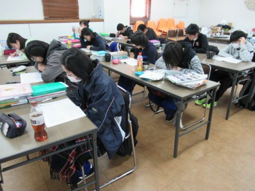 その後、午後がスタート。中3生は12月のはじめ以来の5科の時間を計っての予想模試演習。高3生は、贅沢にもI先生、M先生との1対1の学習組。K先生との1対2での英語演習。そして現代国語と古文は私の授業です。