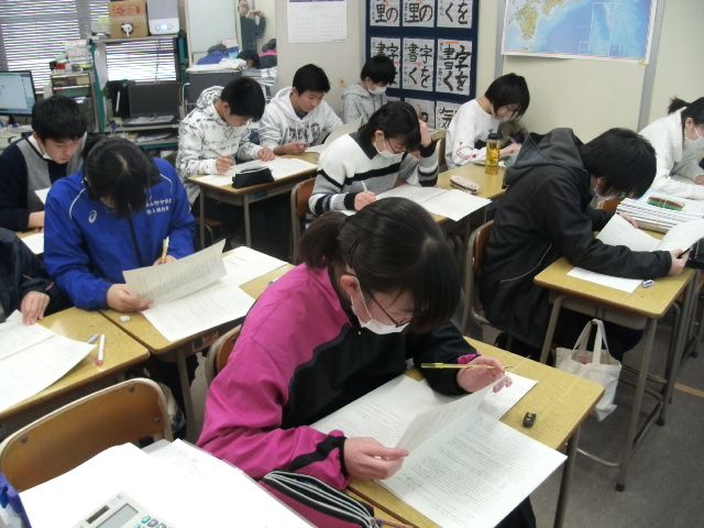 中3生は4回目の予想問題演習です。問題の解きはじめに“わさわさ”しないことを注意してスタートです。14日の当日は、ただでさえ緊張します。ふだんのチカラをだせるようにするにはどうしなければいけないか、ということをしっかりと考えて問題に向かうことが大切です。