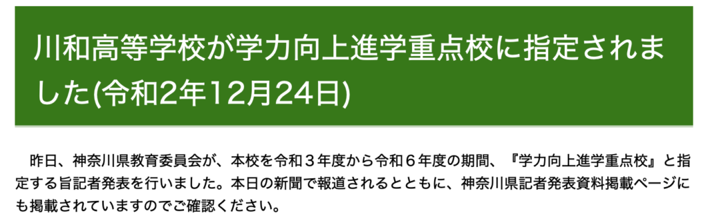 進学重点校、進学重点エントリー校について、県教委から23日に発表がありました。 1 新たに川和高校を令和3年度から進学重点校に指定する。 https://www.pref.kanagawa.jp/docs/dc4/prs/r3246020.html 2 新たに「横浜国際高校」を進学重点エントリー校に... -