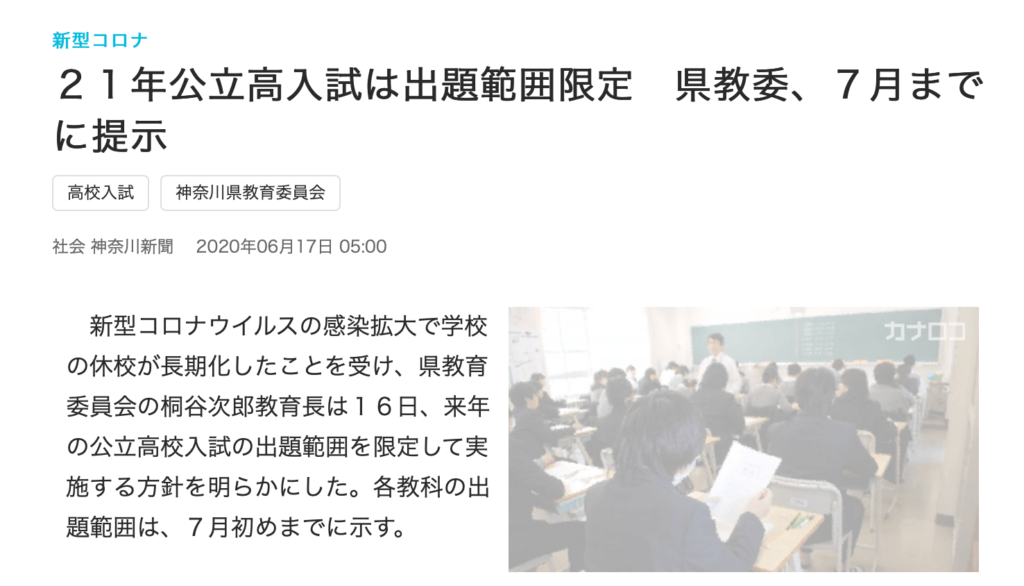 先日も書きました https://miyajuku.com/20200530-コロナ後について/ が、高校入試の出題範囲が神奈川県も減るようです。 https://www.kanaloco.jp/article/entry-382650.html 「安心して受験できるように、3年生が受験までに学んだ内容のみから出題す... -