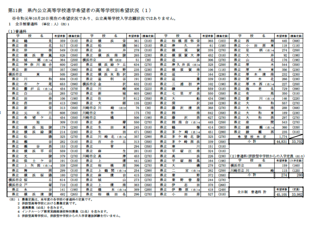 神奈川県教委から来春高校入試での「高校別進学者希望者数」の一覧が発表になりました。 http://www.pref.kanagawa.jp/docs/u5t/edu_stat/jr_high_course_hope/r01_result.html これは10月20日に県内の中学校で67,081名の中学3年生を対象として、その段階... -