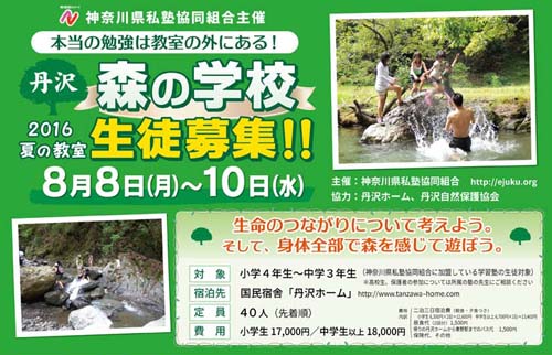 今年の夏に実施する「森の学校」の案内ができてきました。miyajukuの生徒さんのご家庭には、6月のお知らせといっしょにお送りします。たくさんの生徒さんに参加していただきたい企画です。 「森の学校」は、丹沢自然協会で子どもを対象に長い間実施されて... -