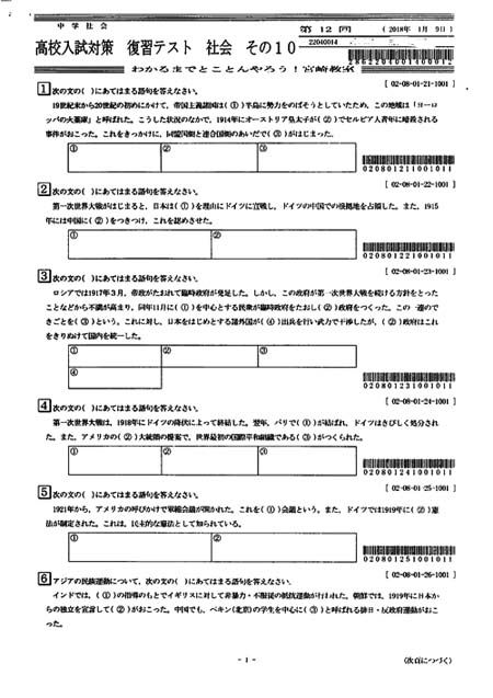 中3生は、毎週、日曜日に、5教科の予想問題をやり、その後に解き直しの授業をおこなっている。県高校入試は、どの教科もある程度は決まった出題形式になっている。たとえば、英語は、問1がリスニング、問2が英単語、問3が空所補充、問4が並べ替え、問5と問... -