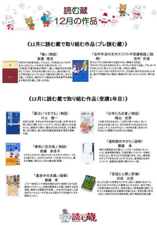 「読む蔵」の12月に読む作品です。「読む蔵」はPCやタブレットを利用した国語力アップのためのツールです。こんな流れで学習が進みます。語彙チェック ↓読書速度計測 ↓視線移動トレーラング ↓読み込みトレーニング ↓読解チェックいわゆる速読... -