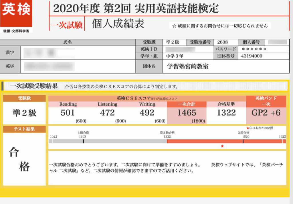 第2回の英語検定試験の結果がネットで発表になっています。受験した生徒と保護者の方には「個人成績表」のスクリーンショットをLINEと公式LINEで送りました。確認してください。3級以上の合格者は2次の面接試験があります。対策は塾でおないますが、英検の... -
