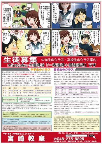 新学期のチラシが刷り上がってきました。2/25日と3/4日の火曜日に新聞折り込みの予定です。今回は漫画でmiyajukuを伝える試みをしてみました。4コマ漫画で塾の様子を伝える。簡単なようで難しかったです。漫画家さんとイメージの段階から打ち合わせをして...