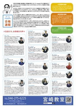 チームmiyajukuの合格報告、という形で今年の入試の報告チラシを16日の週にポスティングします。生徒たちの声と、お母様からいただいた声を併記しました。miyaukuのようすを最もよくわかっていただけるのでは、と思います。逆面は、この春から取り組む「家... -