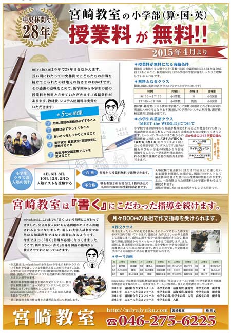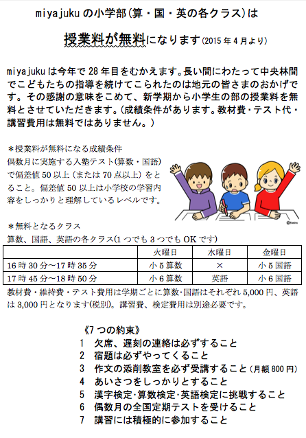 miyajukuは今年で28年目をむかえます。長い間にわたって中央林間でこどもたちの指導を続けてこられたのは地元の皆さまのおかげです。その感謝の意味をこめて、新学期から受験しない小学生の部の授業料を無料とさせていただきます。(成績条件があります。教... -