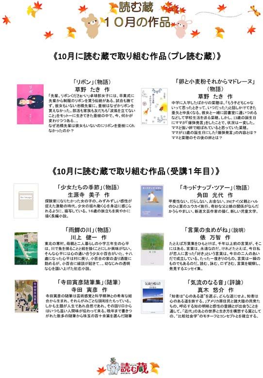 10月の「読む蔵」の作品紹介です。中でも、受講1年目の「キッドナップツアー/角田光代作」、受講2年目の「卒業ホームラン/重松清作」は、入試問題に必出の作品ですし、とても読みやすく作品世界に入りやすいので、読書習慣をつけるきっかけに最適な作品で...