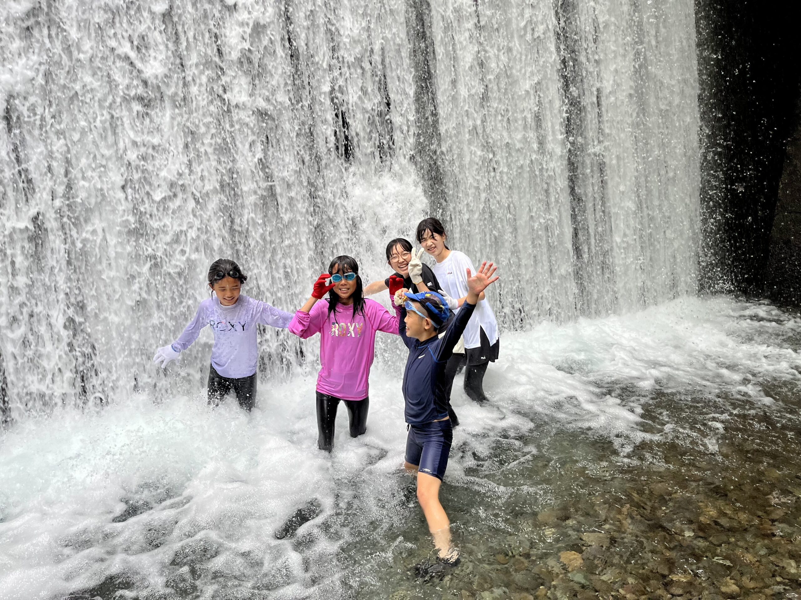 今日は慧真館の生徒たちも一緒に沢を少し詰めて上っていきます。小学校低学年の子たちは下流で遊んで待ってもらいます。ごつごつした大きな岩をよじ登り、激しい流れでは手に手を取って到着です。おっきな堰堤の滝がゴーゴーと流れ落ちています。キャー、ワー、と言いながら何人かは滝の下に身をおこうとチャレンジしていました。こんな体験はそうできるものではありません。
