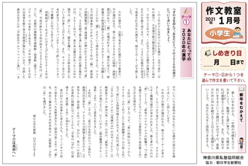 毎月、朝日小学生新聞から2つのテーマを抽出し、その記事を読んで400字程度の作文を書いていきます。