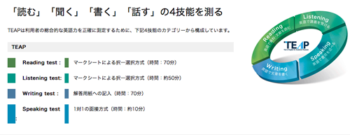 TEAP(ティープ)とは、Test of English for Academic Purposesの略語で、上智大学と公益財団法人 日本英語検定協会が共同で開発した、大学で学習・研究する際に必要とされるアカデミックな場面での英語運用力(英語で資料や文献を読む、英語で講義を受ける、英語で意見を述べる、英語で文章を書くなど)をより正確に測定するテストです。