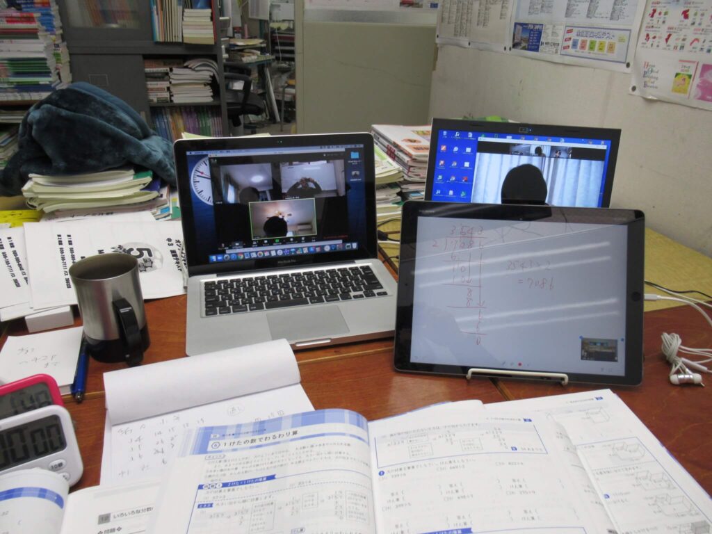 メインのPCを操作して手もとのiPadを3つの小部屋を移動させます。もう1台のPCは、ひとつの小部屋で指導中の他の小部屋の様子を映し出しています。それを見ていれば、生徒が困っているのか、順調に問題を解いているのかがわかります。